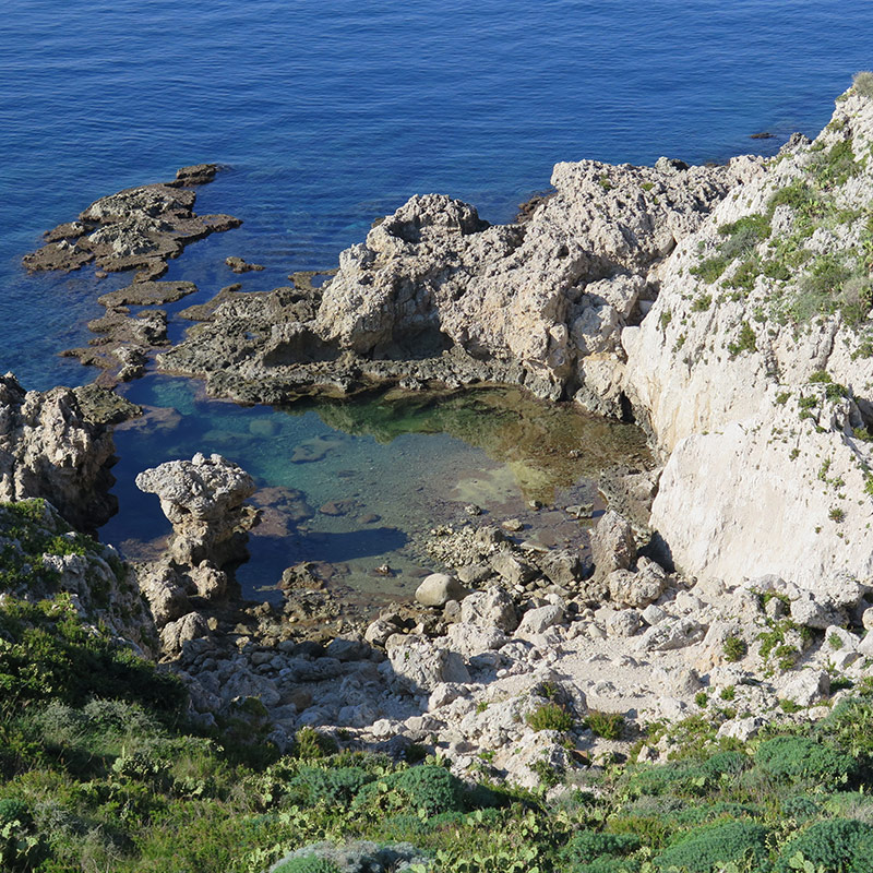Continuing along the path we reach an extraordinary vantage point, with views of the Aeolian Islands, where a stepped concrete path begins, descending to the coast. A fork leads, descending still on the right, on the end of the peninsula, towards to the naturalistic attraction of a natural swimming pool, the Laghetto di Venere, a nook and cranny of rocks and stones over a pool of crystal-clear, calm sea water. There one can take a refreshing bath and venture with a diving mask as up to over far as the beyond the limit of the inlet, into the open sea. The view of the Mediterranean seabed, in a protected area, is of the most spectacular, among multicolored fish, mollusks and sea plants.